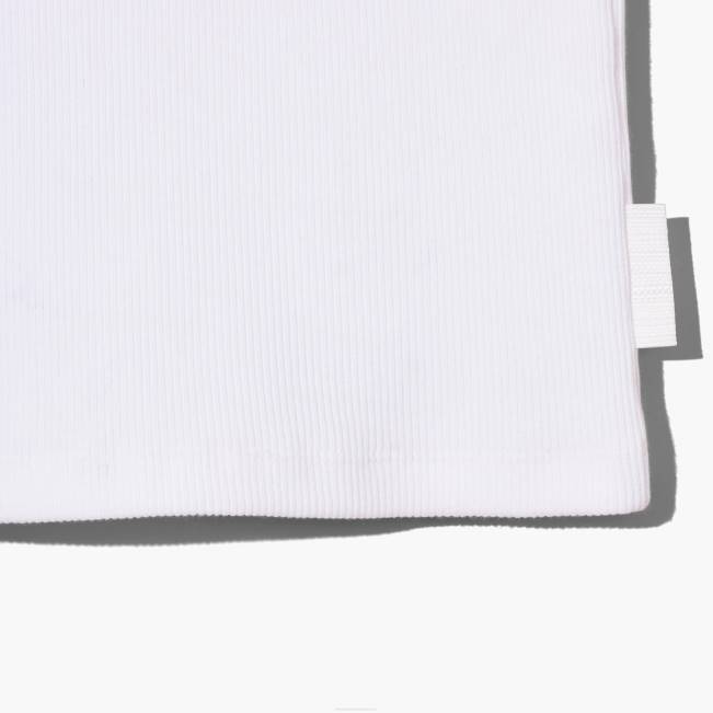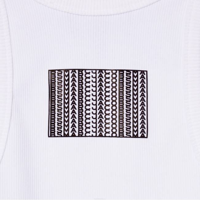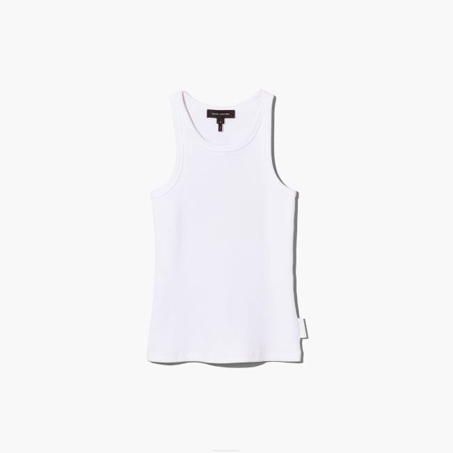 ה-mj טוויסט על מיכל צלעות המתיחה החיוניים. חתוך עם צוואר גבוה, צללית תער, וסיים עם תיקון ברקוד מונוגרמה ניגודיות מאחור. shop marc jacobs the icon rib tank