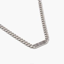 שרשרת השרשרת הקלאסית, המושפעת מאהבתו של מארק לסגנון הגראנג’, כוללת את לוח הזיהוי החדש של מונוגרמה ברקוד בחזית ועשויה מפליז מצופה כסף. מאובטח עם אבזם הלובסטר. חנות Marc Jacobs שרשרת שרשרת מונוגרמה מזהה ברקוד